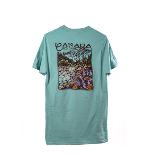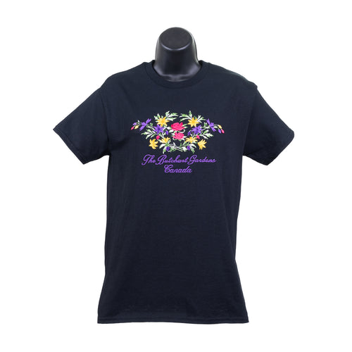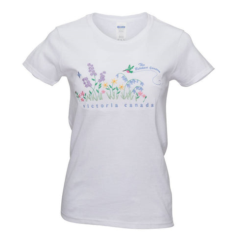 Ladies 50% cotton/50% polyester Butchart Gardens powder blue fleece with beautiful embroidered flowers on front. Cold water wash, tumble dry low.